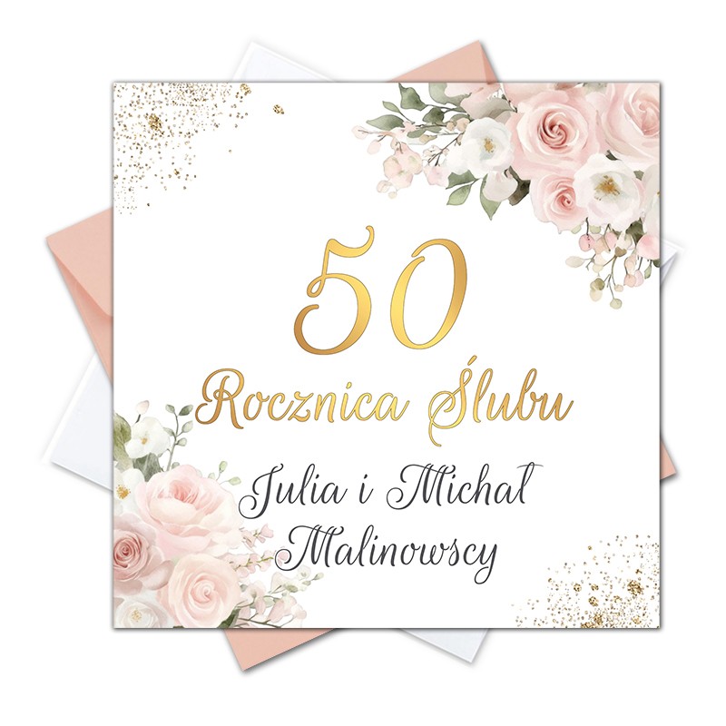 Personalizowane imiona i nazwisko jubilatów, pełna personalizacja tekstu wraz z gośćmi.