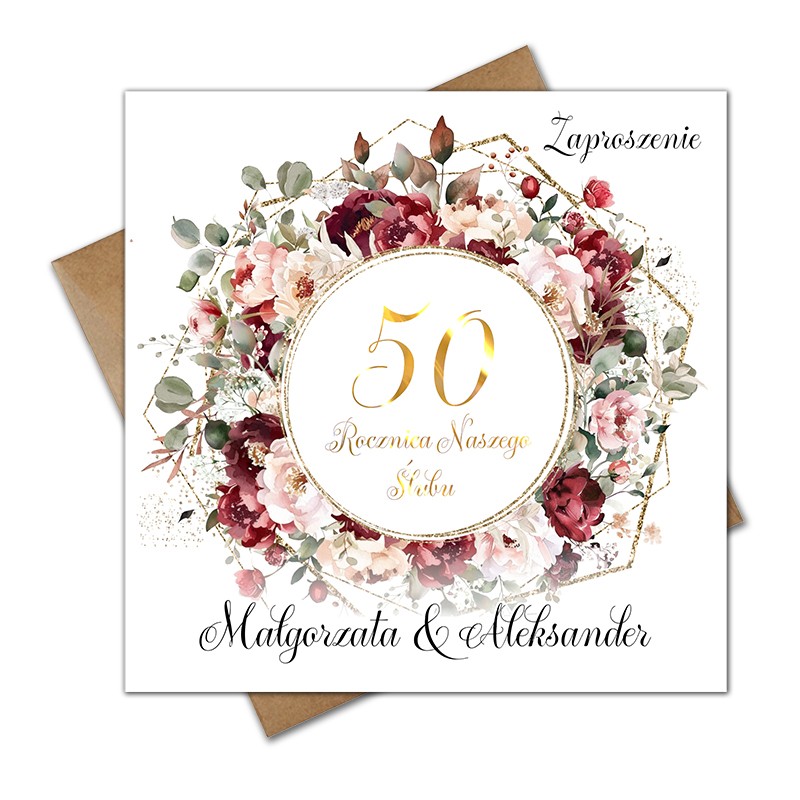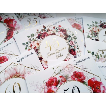 Na przodzie zaproszenia, w środku wianka kwiatów, liczba rocznicy oraz napis "Rocznica Naszego Ślubu" jest pokryta złoceniem.