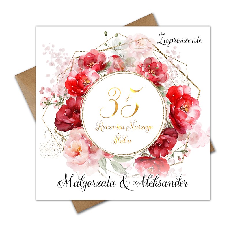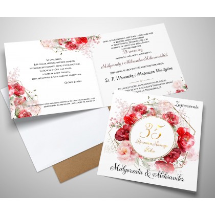 Na przodzie zaproszenia, w środku wianka kwiatów, liczba rocznicy oraz napis "Rocznica Naszego Ślubu" jest pokryta złoceniem.