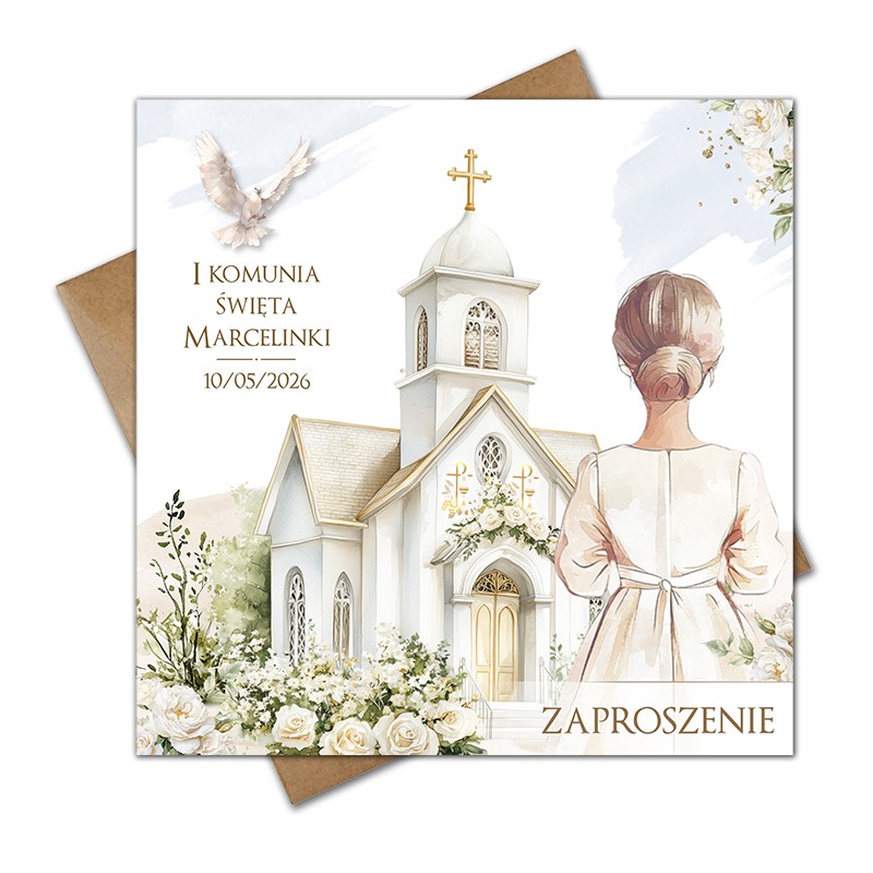 Na przodzie zaproszenia motywem przewodnim jest kościół udekorowany do ceremonii I Komunii Świętej, wraz z dziewczynką idącą w stronę wejścia.