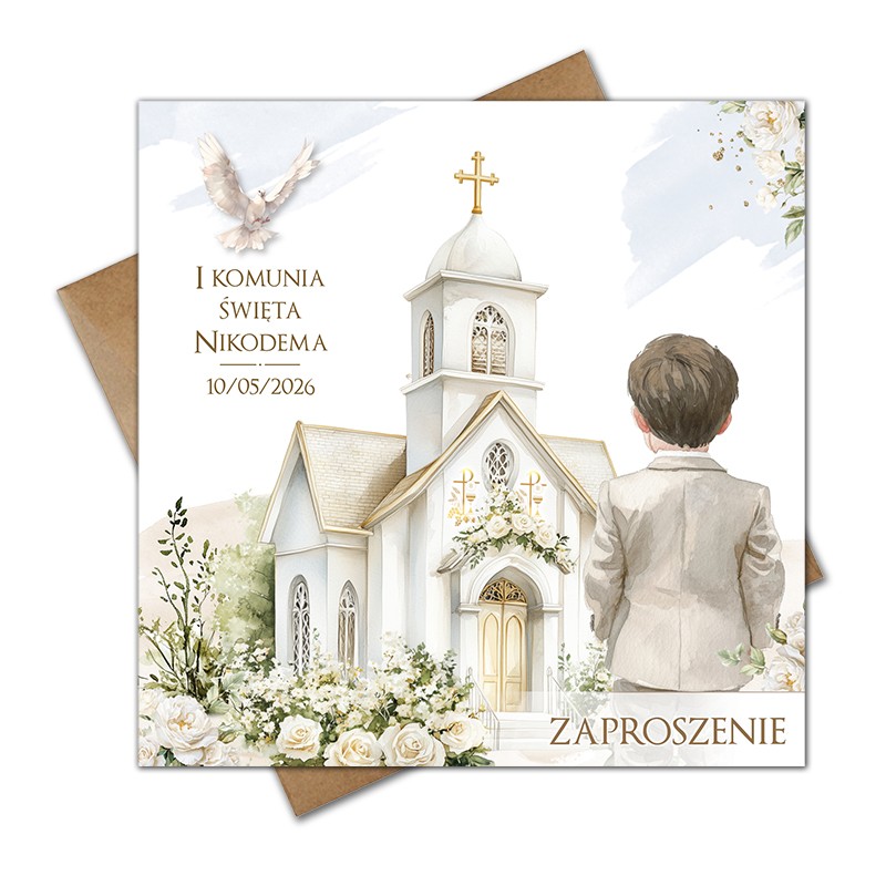 Na przodzie zaproszenia motywem przewodnim jest kościół udekorowany do ceremonii I Komunii Świętej, wraz z dziewczynką idącą w stronę wejścia.