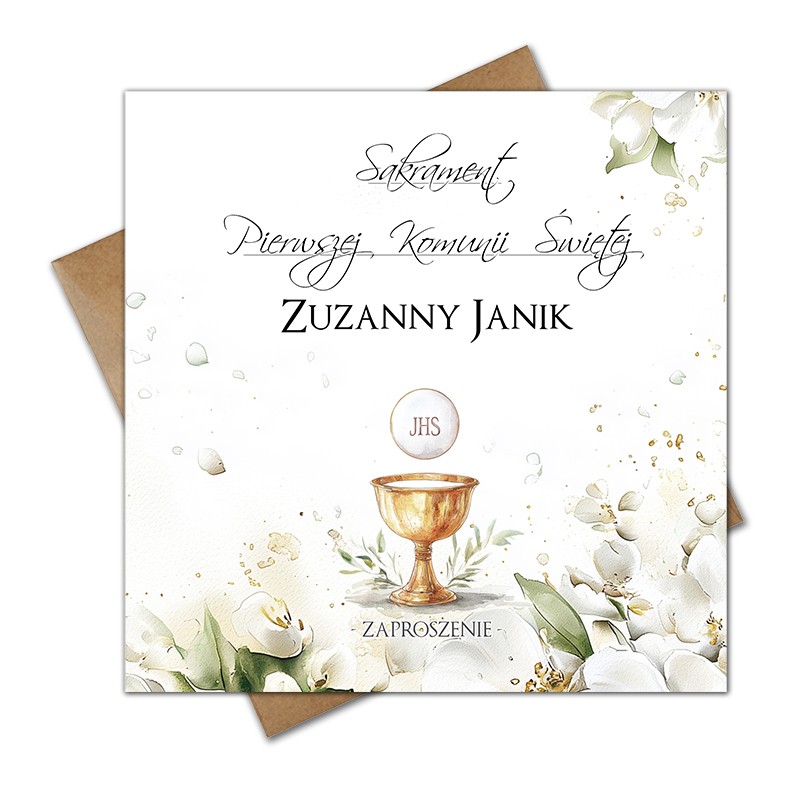 Na przodzie zaproszenia motywem przewodnim jest złocona hostia.